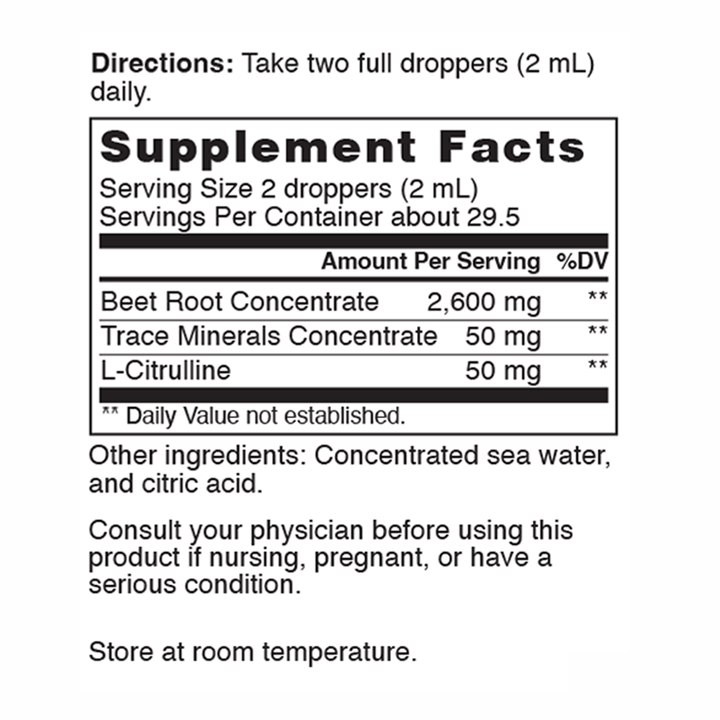 BeetRoot is a fast-absorbing liquid supplement that supports circulation, stamina, and nitric oxide production using beetroot concentrate, L-Citrulline, and trace minerals while fueling clean energy and endurance without stimulants.