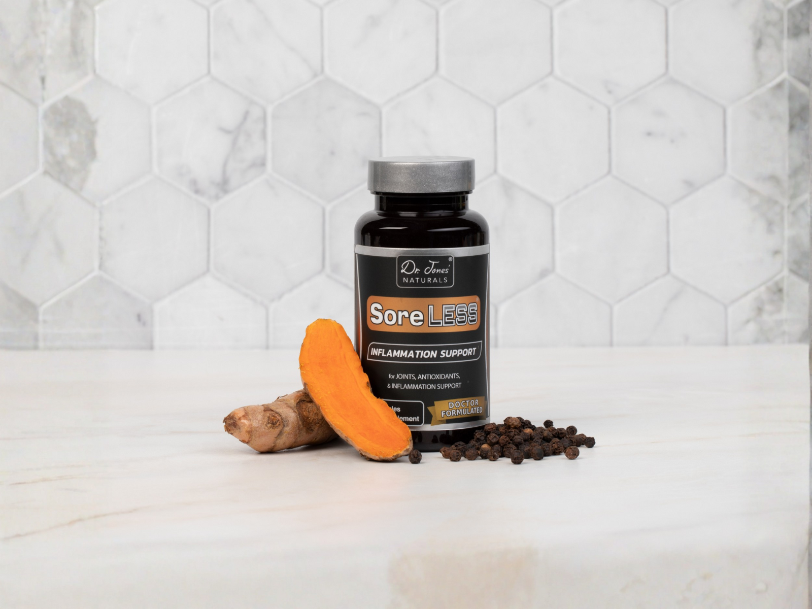Supplement bottle labeled 'SoreLESS' with 'Dr. Jones Naturals' on a white background