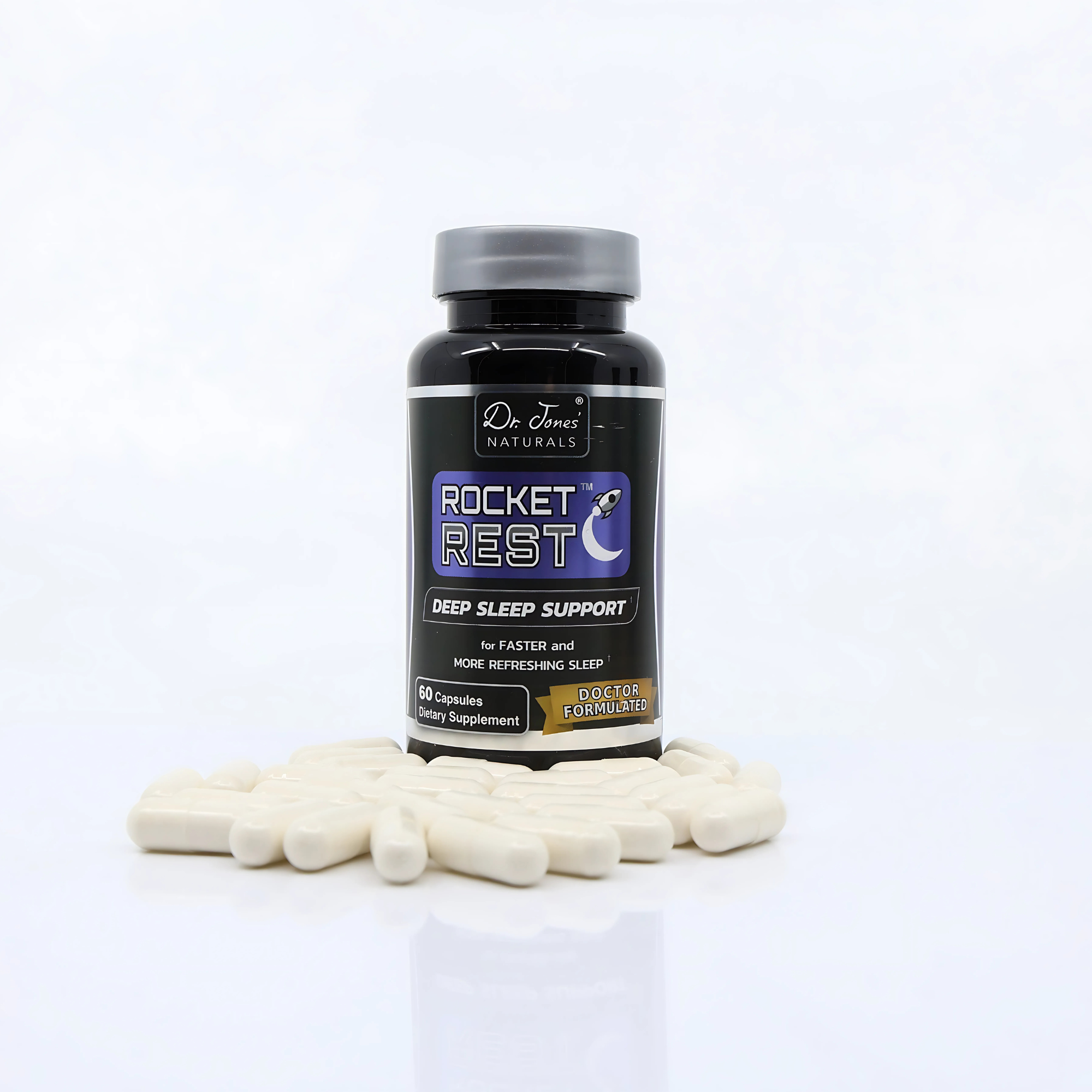 Rocket Rest is a sleep-support supplement combining melatonin, magnesium, L-theanine, GABA, and 5‑HTP to help you fall asleep quickly, stay asleep longer, and wake up refreshed.