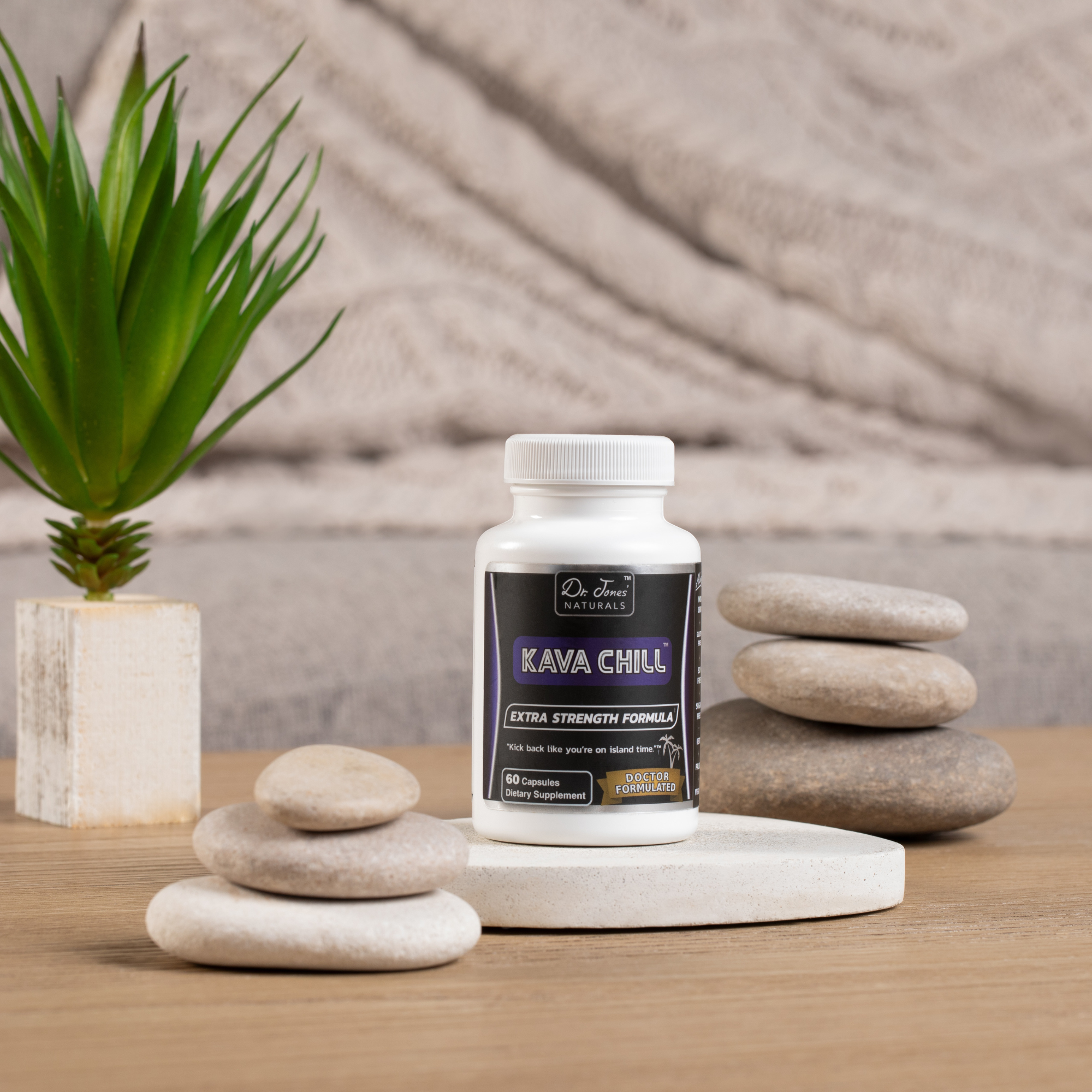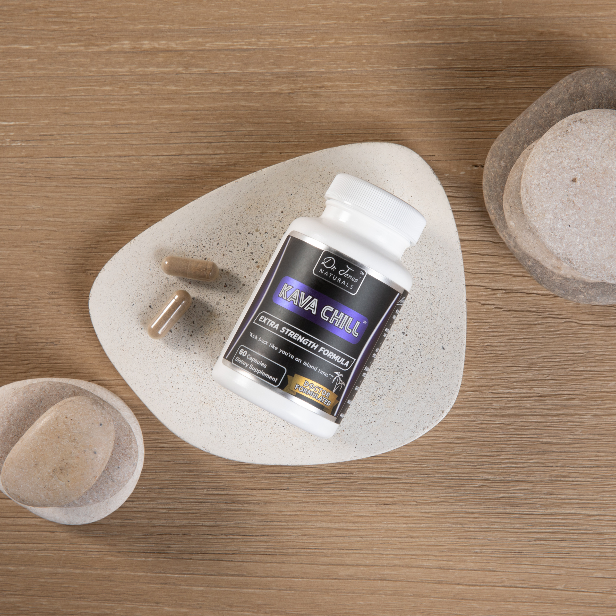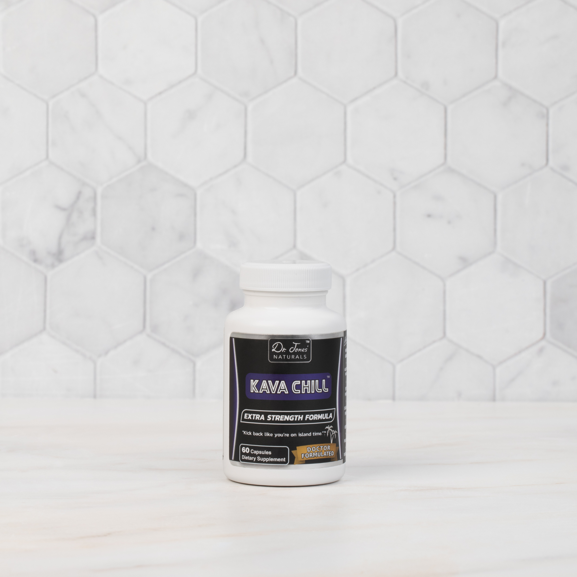 Extra Strength Kava Chill is a relaxation supplement with Kava Kava, Valerian root, Chamomile, and Skullcap to support calm, mood balance, and deep relaxation.