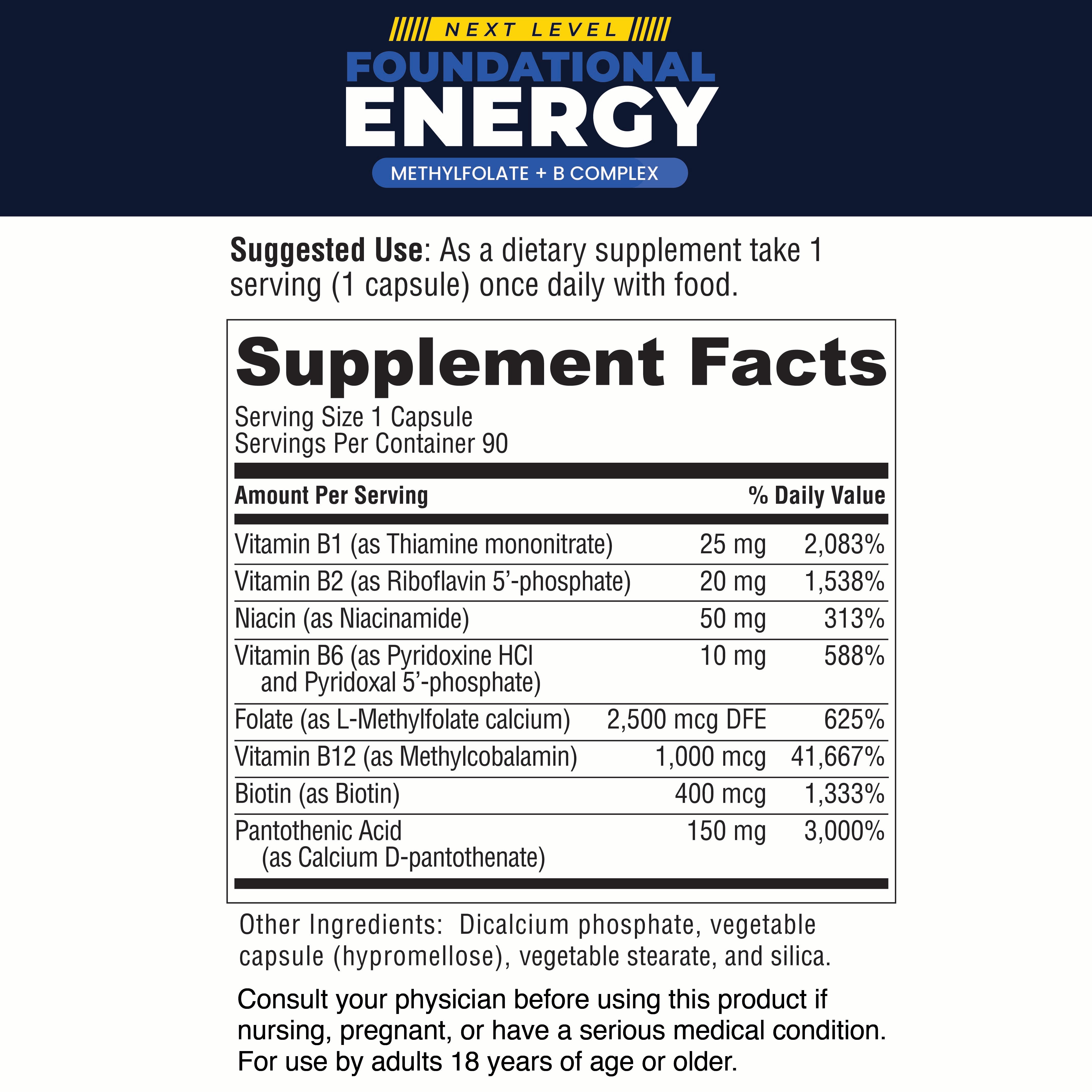 Next Level is a streamlined, high-potency B-complex that makes daily energy support simple. Each capsule delivers a complete blend of bioavailable B-vitamins, including methylcobalamin and L-methylfolate, to fuel metabolism, support mood, and promote mental clarity. With 90 servings in every bottle, it is a long-lasting, convenient way to strengthen your nutritional foundation and keep your energy steady throughout the day.