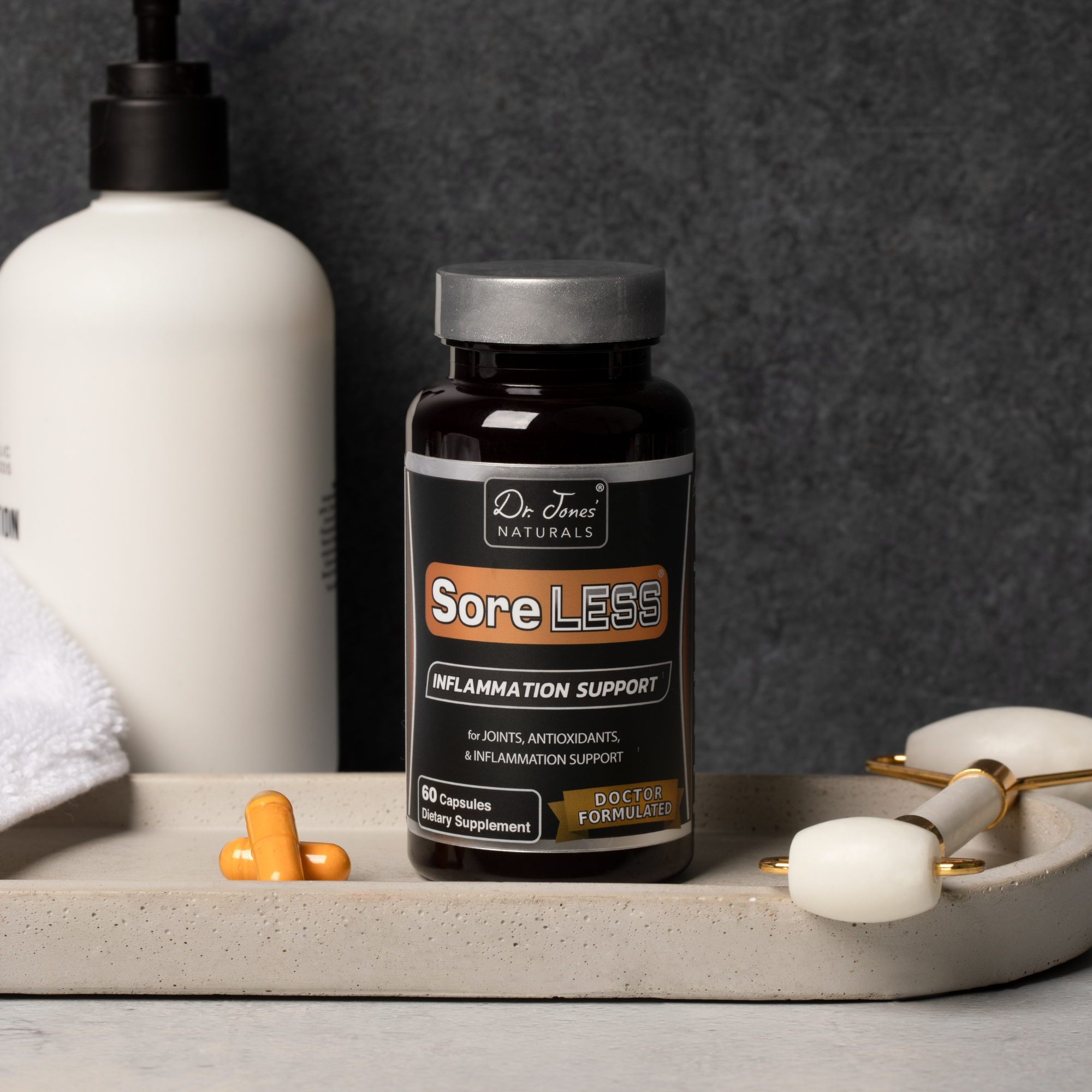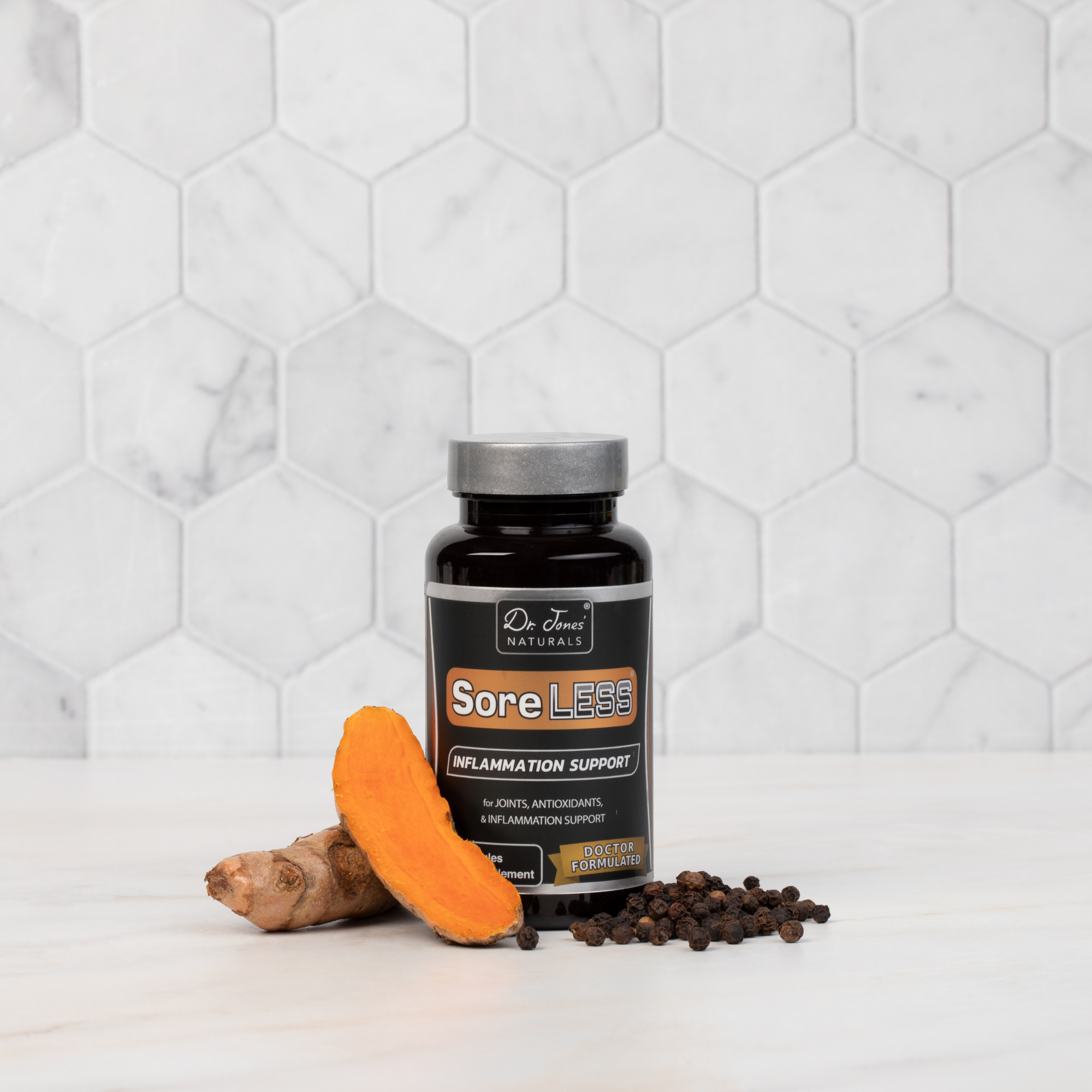 SoreLESS is an inflammation and joint support supplement with turmeric root extract, quercetin, magnesium, berberine, and piperine to help manage post-activity soreness and support daily mobility.